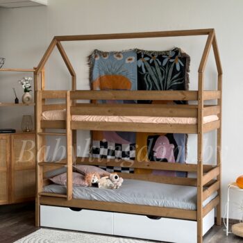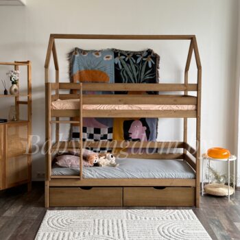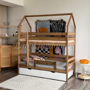 Двухъярусная кровать-домик «Мальта»(антик)+борт из массива сосны 80×180, 90Х200 (с белыми ящиками)