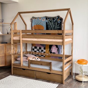 Двухъярусная кровать-домик «Мальта»+борт из массива сосны 80×180, 90Х200 (с ящиками)(антик)