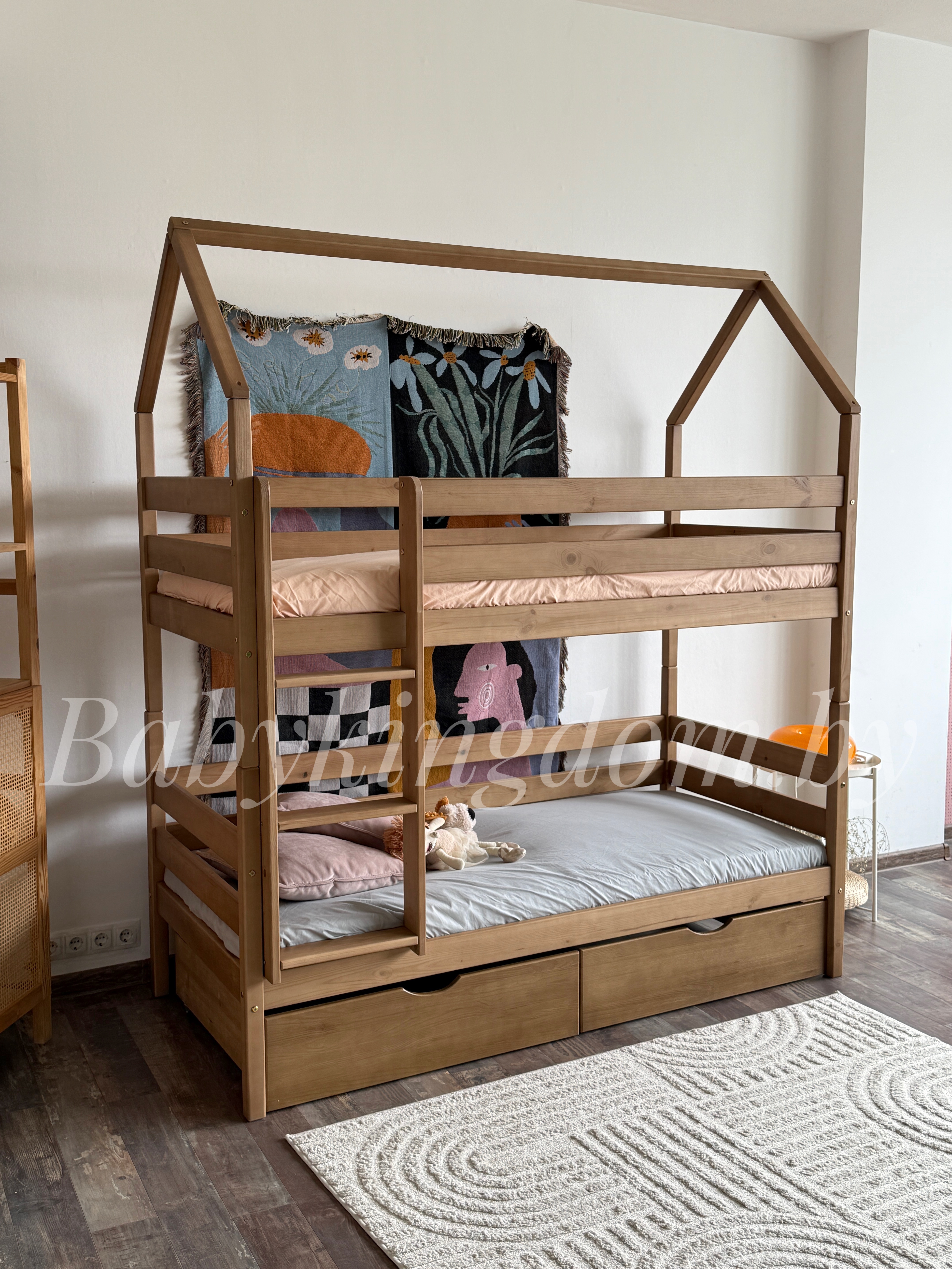 Купить двухъярусную кровать-домик «Мальта» из массива сосны в Минске в цвете антик (80х180, 90х200, с ящиками)