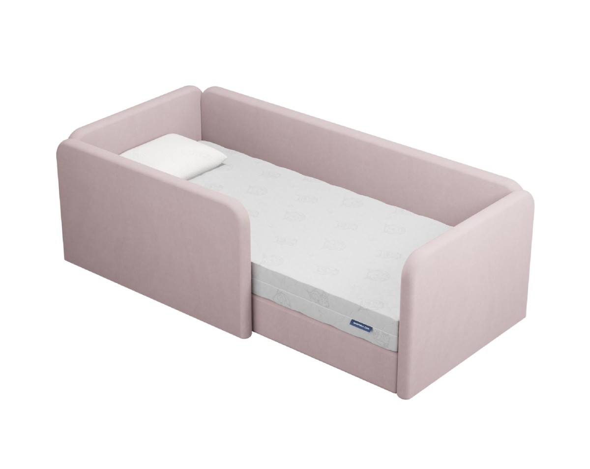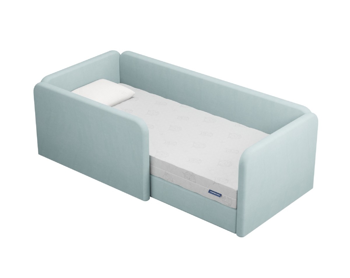 КОТТИ — мягкая кровать для детской от производителя Фабрика сна. Закруглённые формы, мягкие спинки и аккуратный съёмный борт создают ощущение «домика». Такая модель особенно хорошо смотрится в светлом и теплом интерьере, где важны уют и визуальная мягкость.