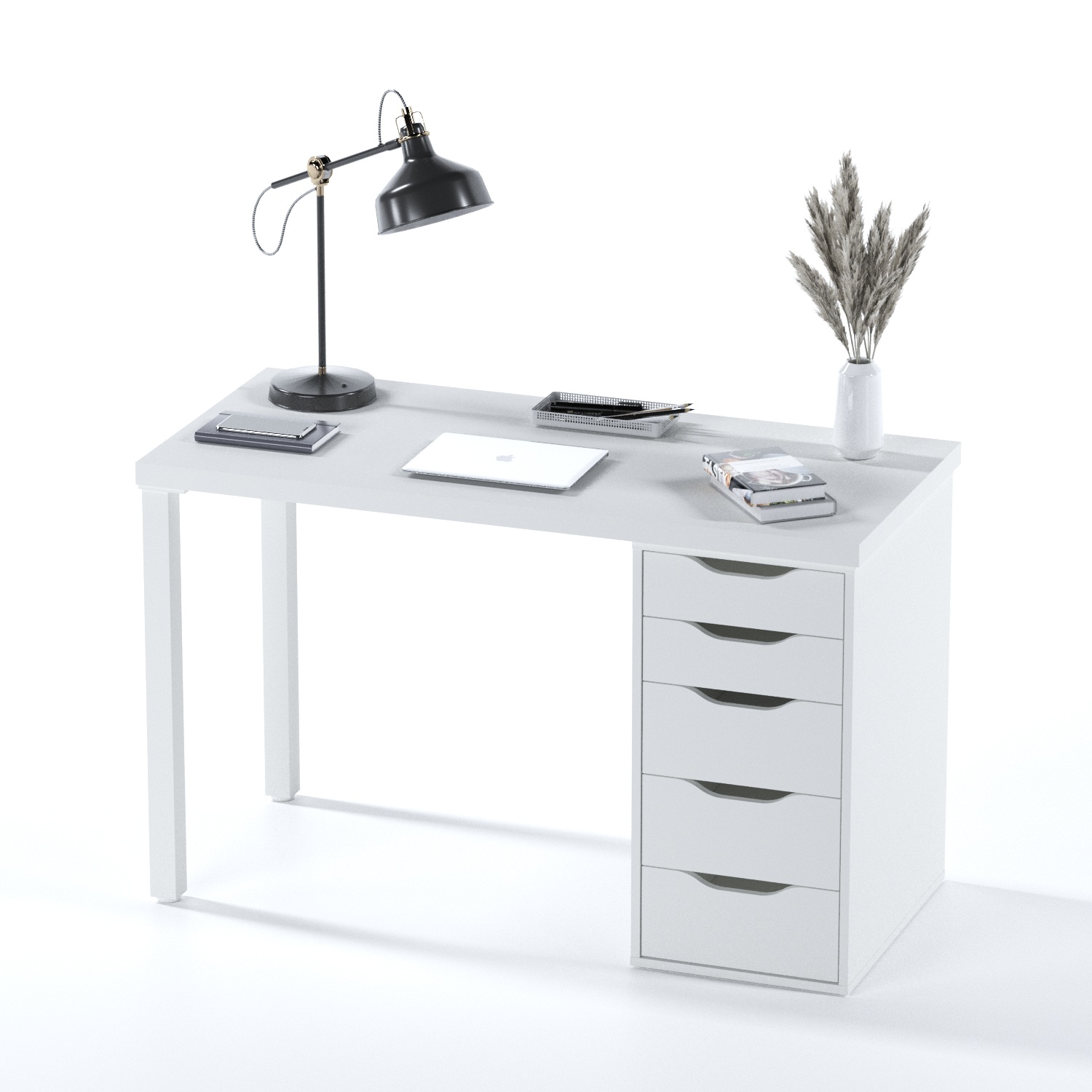 Письменный стол оснащён пятью плавно выдвигающимися ящиками с вырезанными ручками, которые помогают держать письменные принадлежности – карандаши, тетради, учебники – под рукой.
